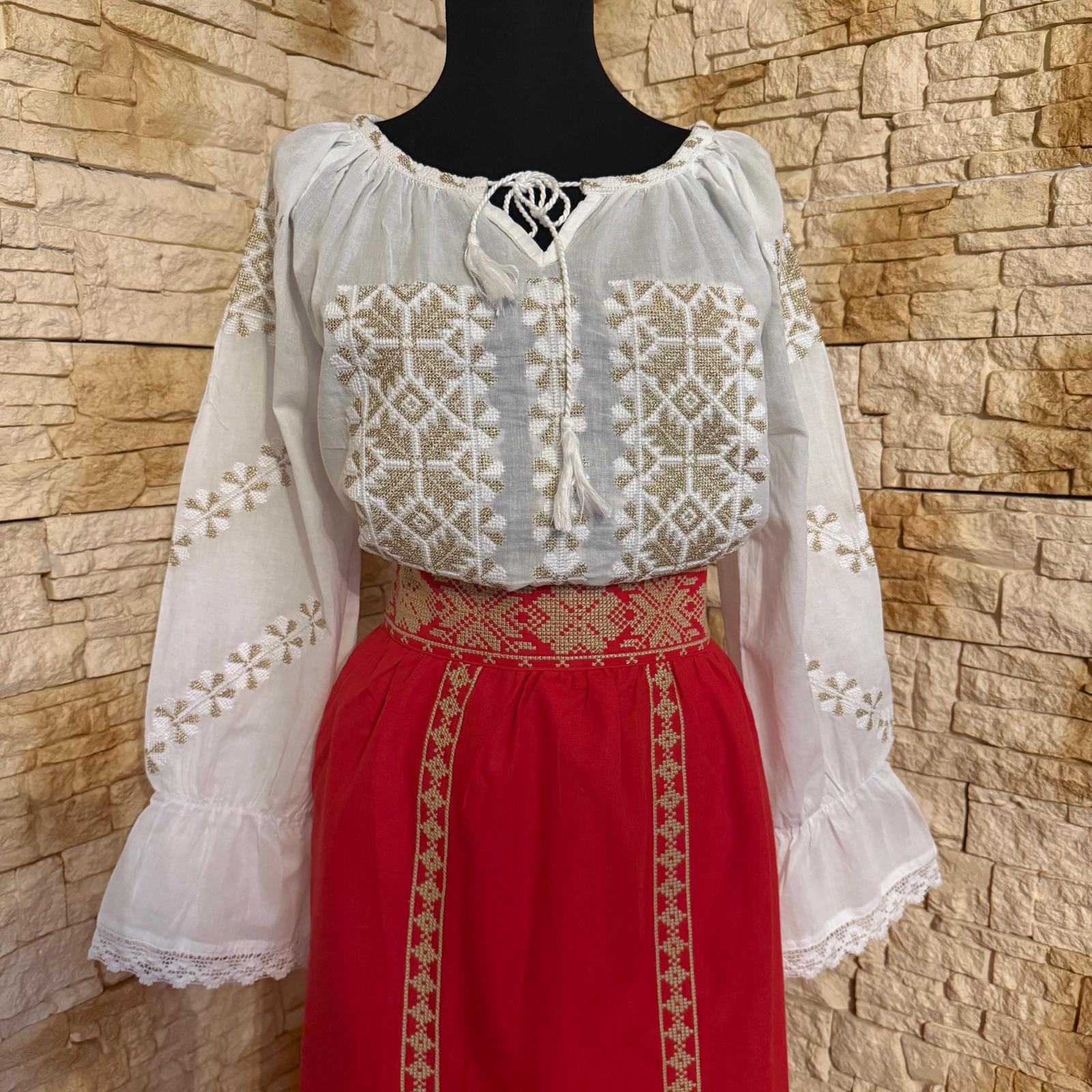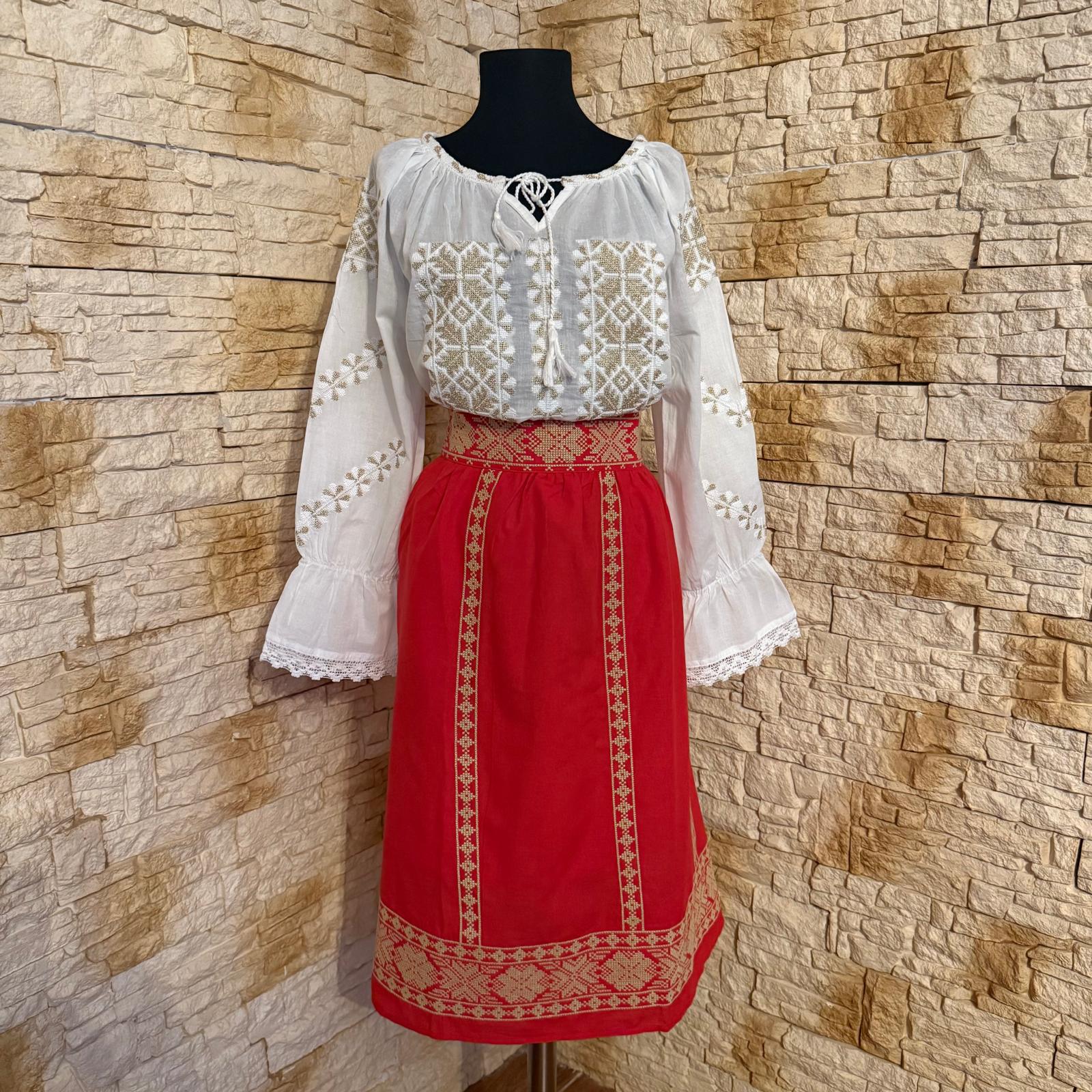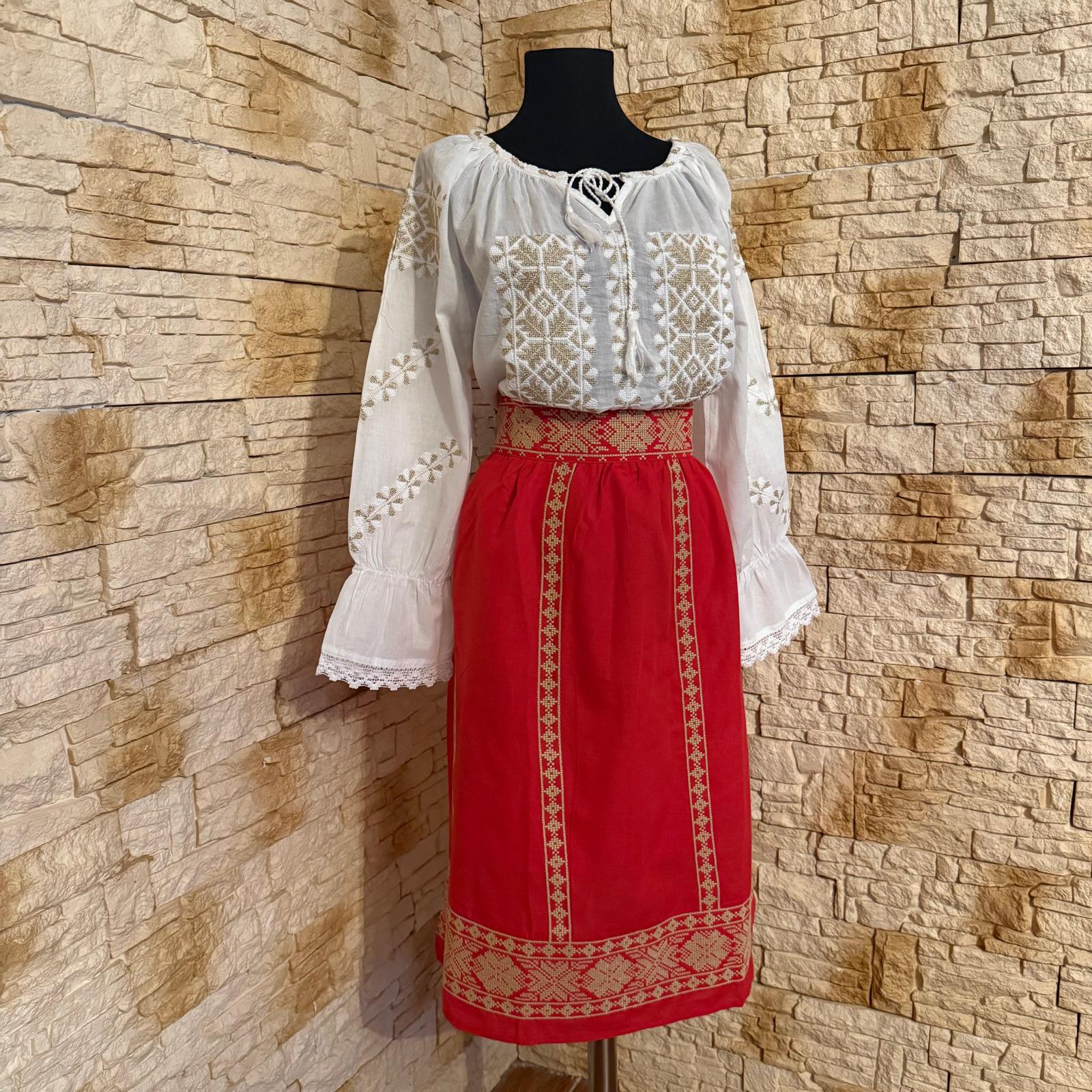 Set ie cu fusta , brodat motiv geometric. Ia este brodata cu ata alba si fir auriu, iar fusta este fond rosu brodata cu ata bej. Fusta este brodata la betelie in partea din fata iar la spate are elastic. In partea de jos si vertical, fusta este brodata de jur imprejur. Nu este transparenta, are jupa. Acesta este un costum ce se poarta cu drag la evenimente culturale sau traditionale.