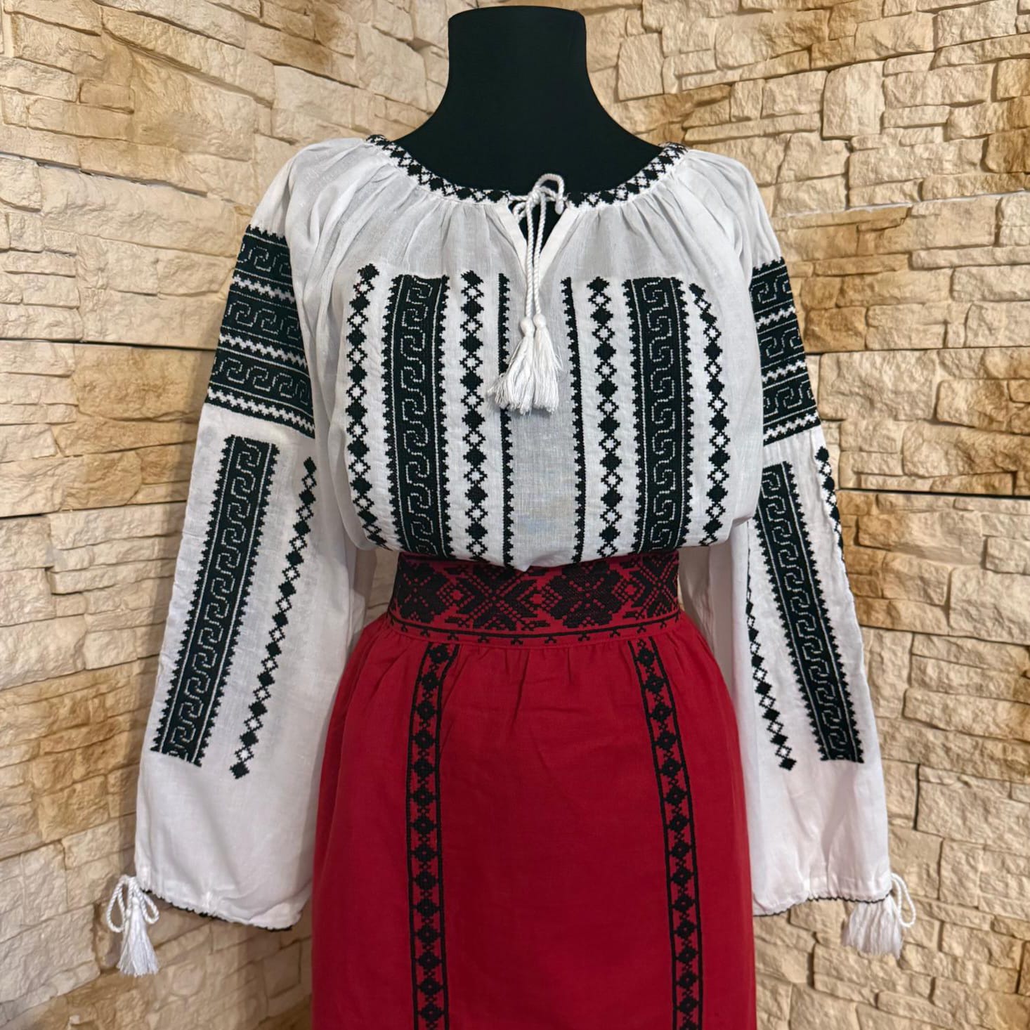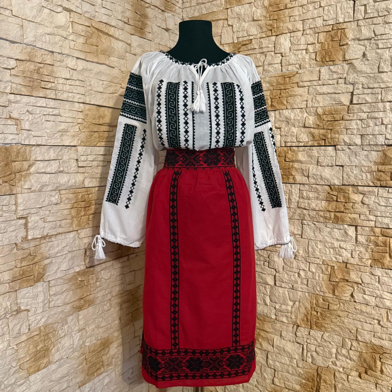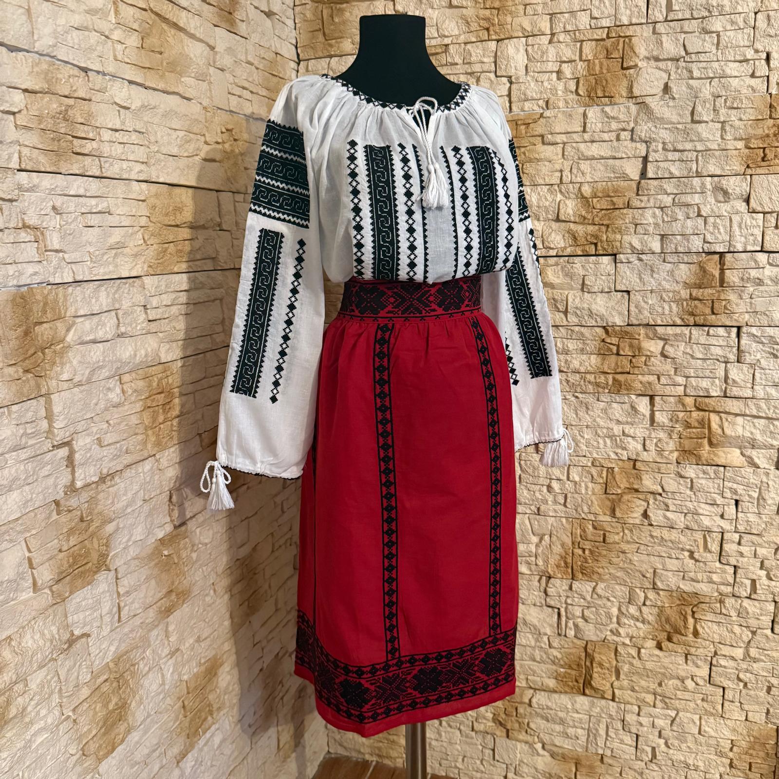 Set 2 piese , ie cu fusta . Ia este brodata cu ata rosie, si verde iar fusta este brodata cu ata rosie, alba si verde. Este un set deosebit si se poarta cu mandrie la evenimente traditionale si culturale.