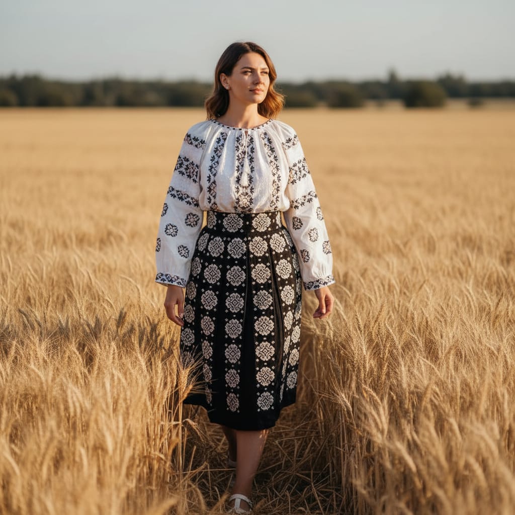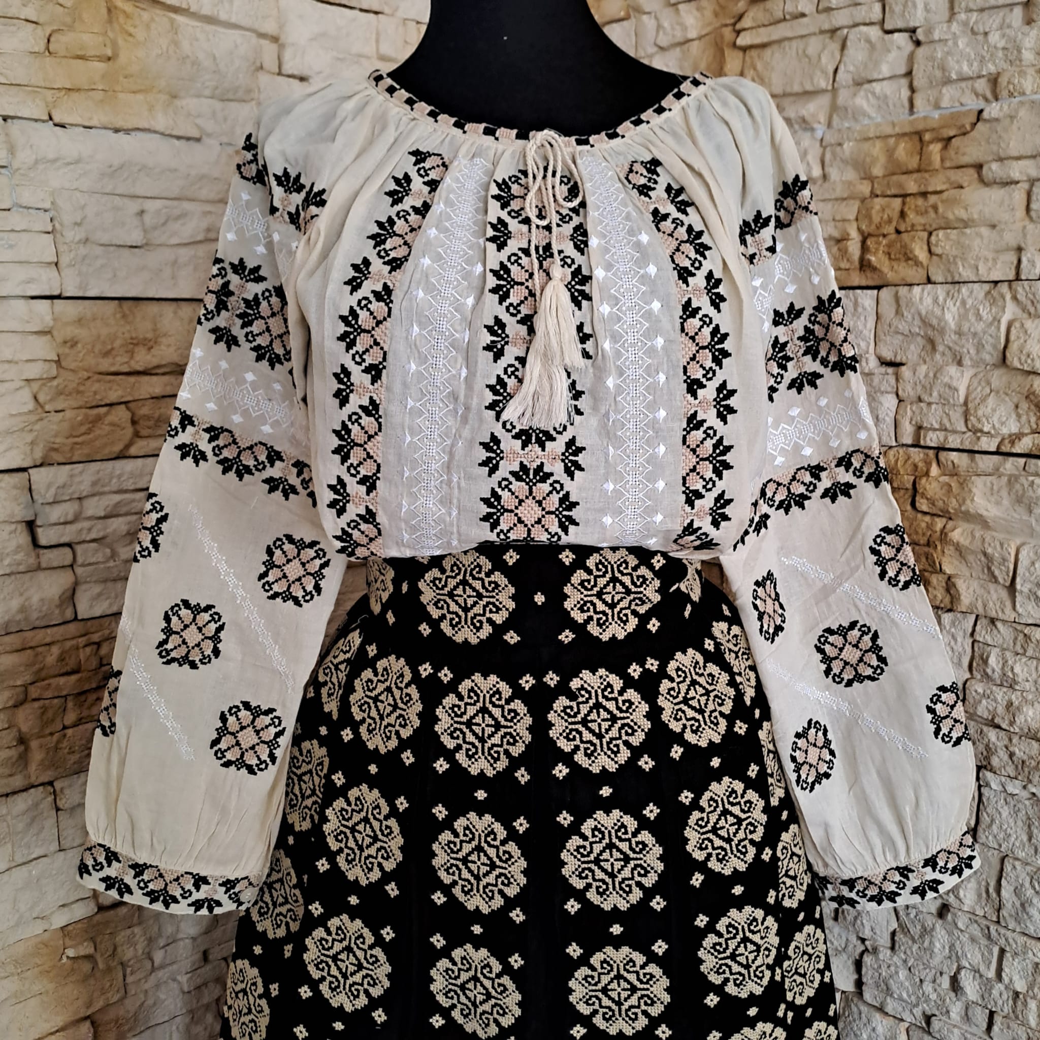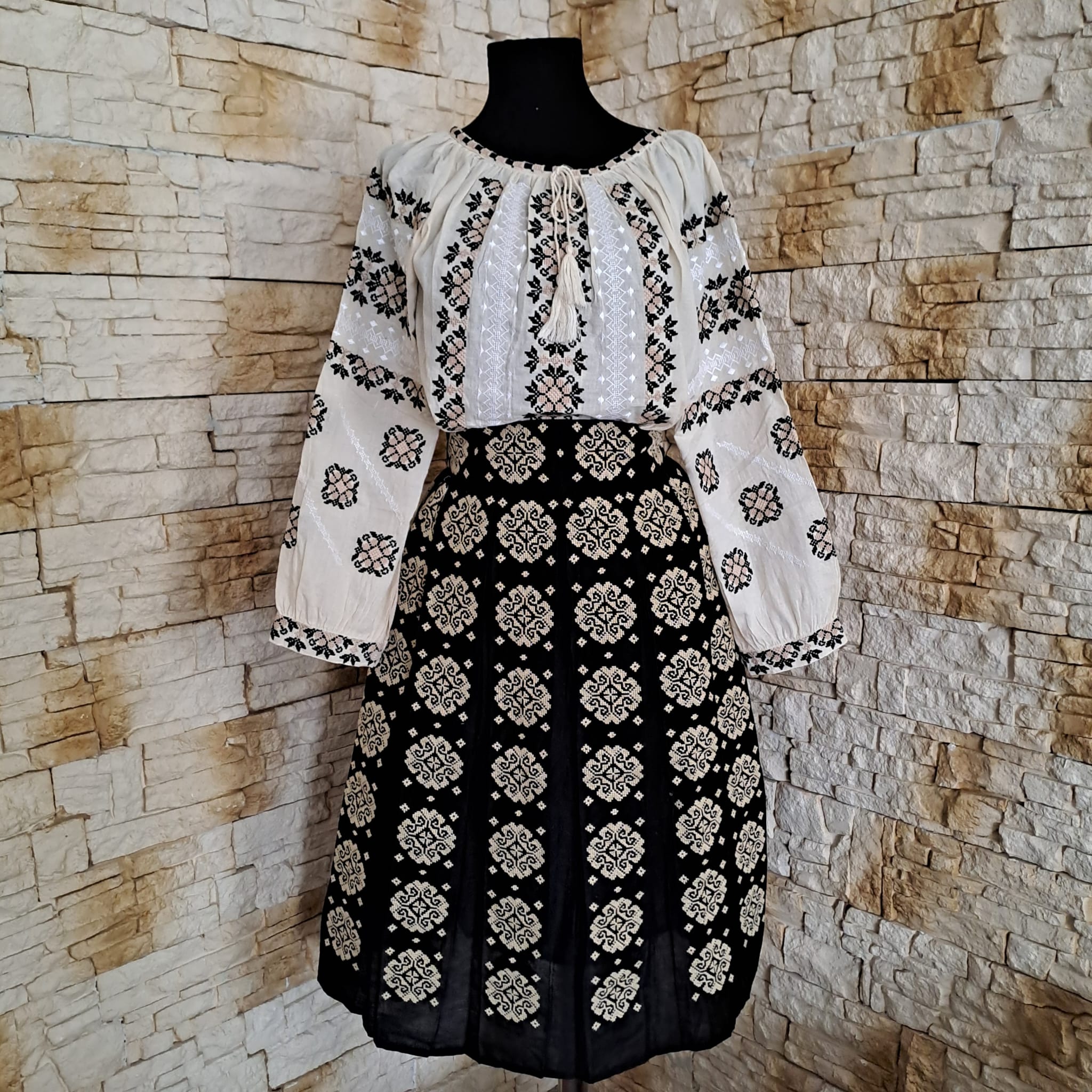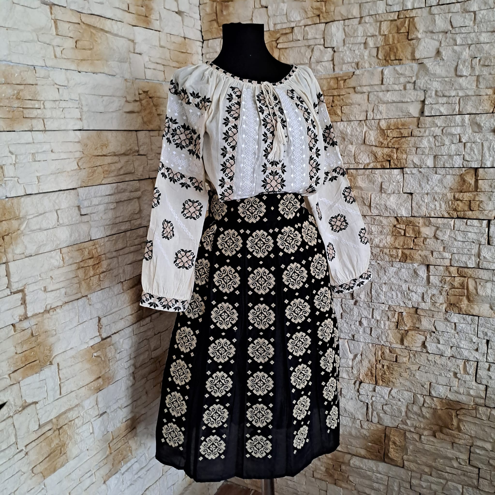 Set ie cu fusta dama, brodata cu motiv geometric. Materialul este in topit.  Fusta este fond negru, brodata peste tot fata/ spate cu ata bej.  La talie in partea din fata este brodata iar in partea din spate este cu elastic. Nu este transparenta, are jupa. Ia este fond bej brodata cu ata maro si crem.
