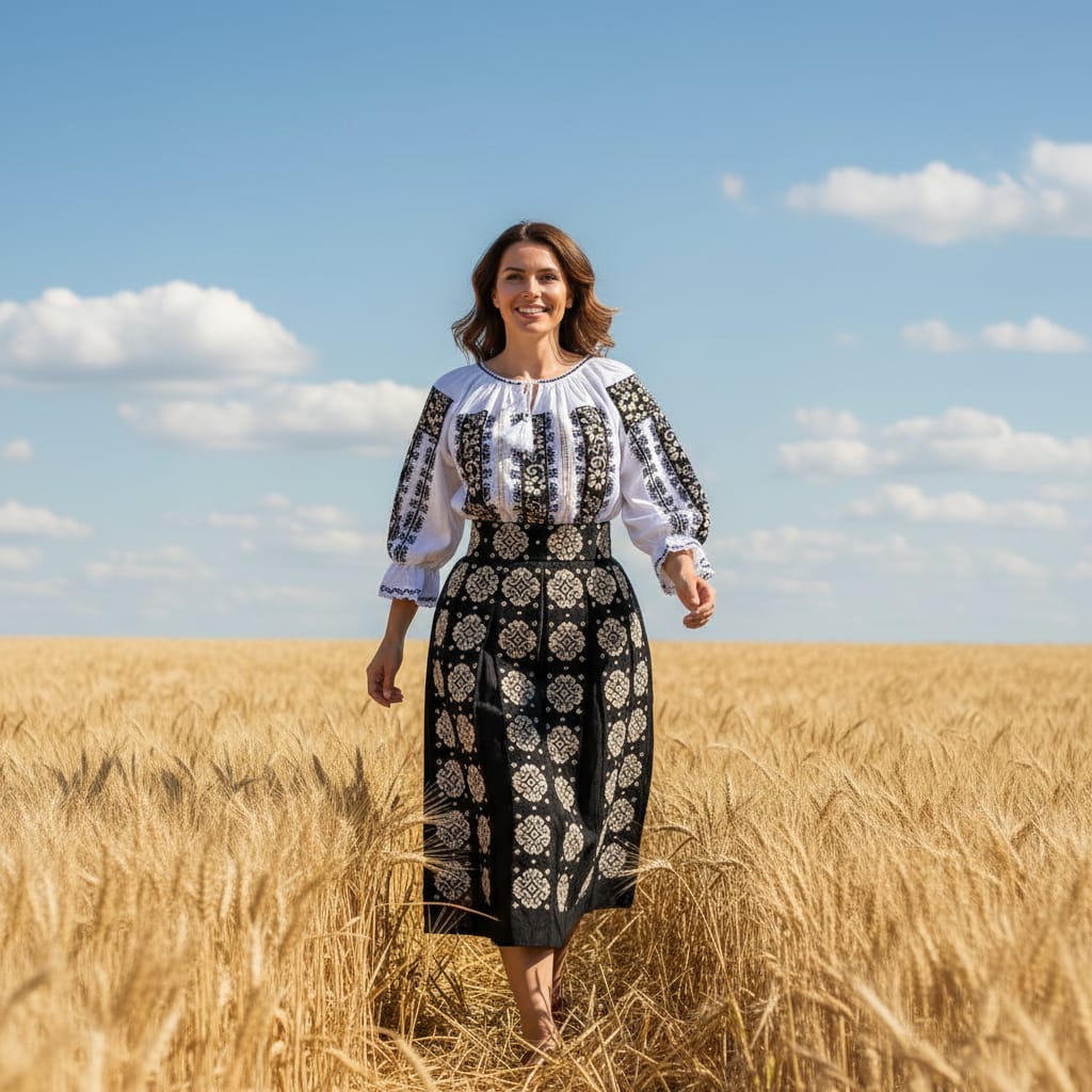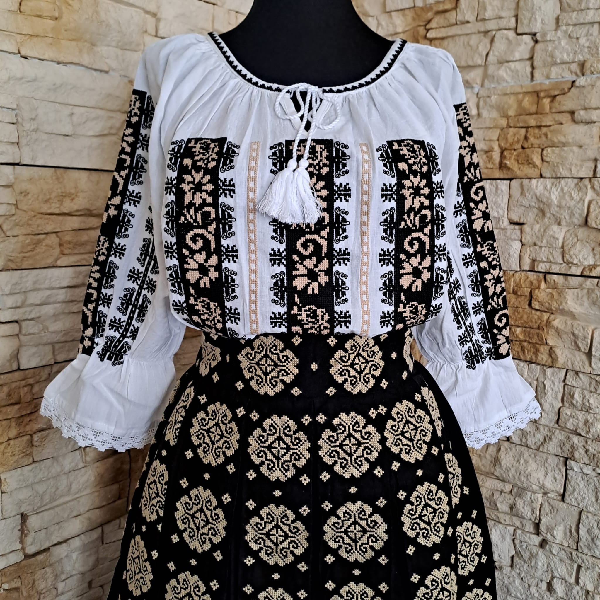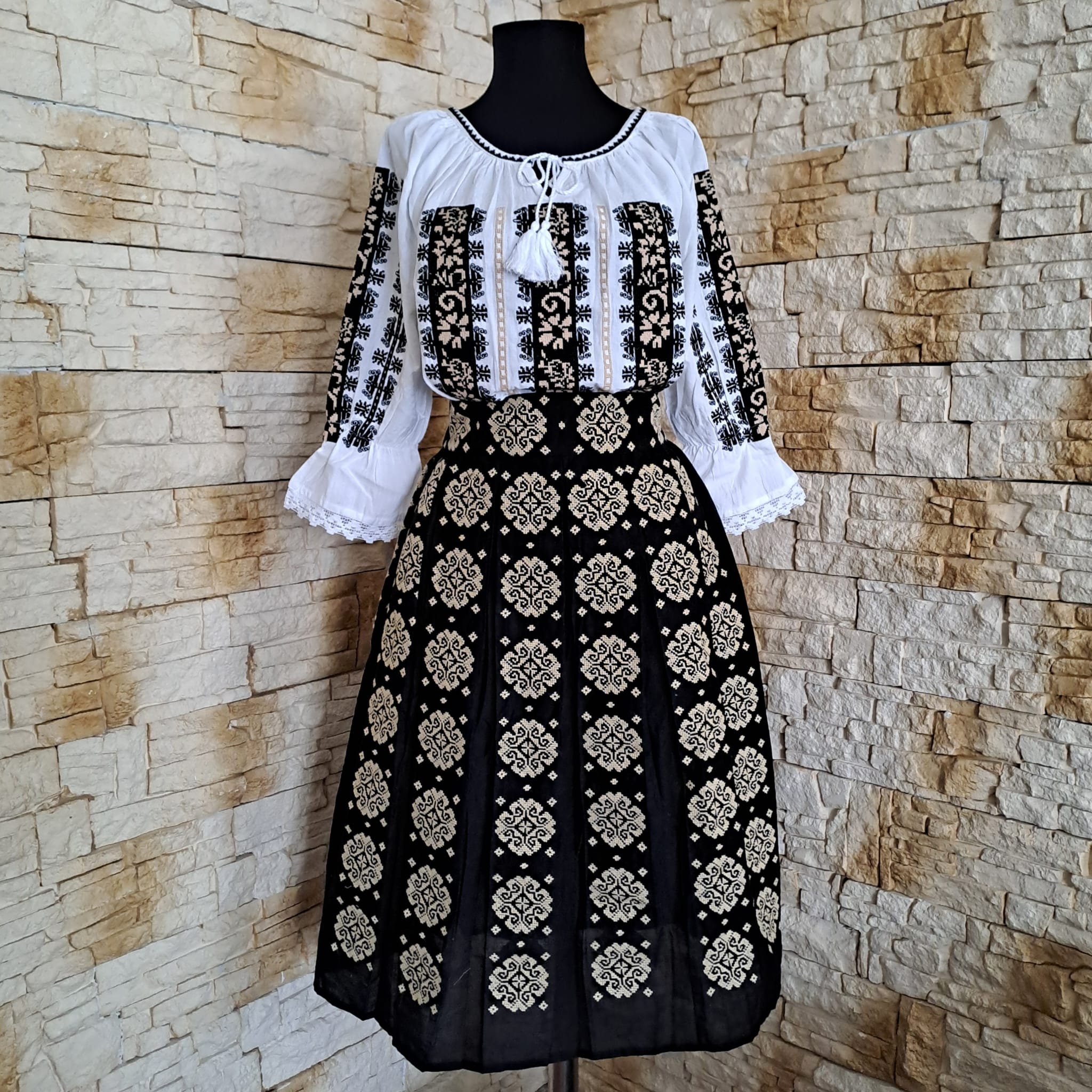 Set ie cu fusta dama, brodata cu motiv geometric. Materialul este in topit.  Fusta este fond negru, brodata peste tot fata/ spate cu ata bej.  La talie in partea din fata este brodata iar in partea din spate este cu elastic. Nu este transparenta, are jupa. Ia este fond alb brodata cu ata bej si negru.