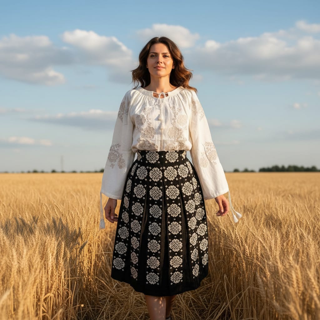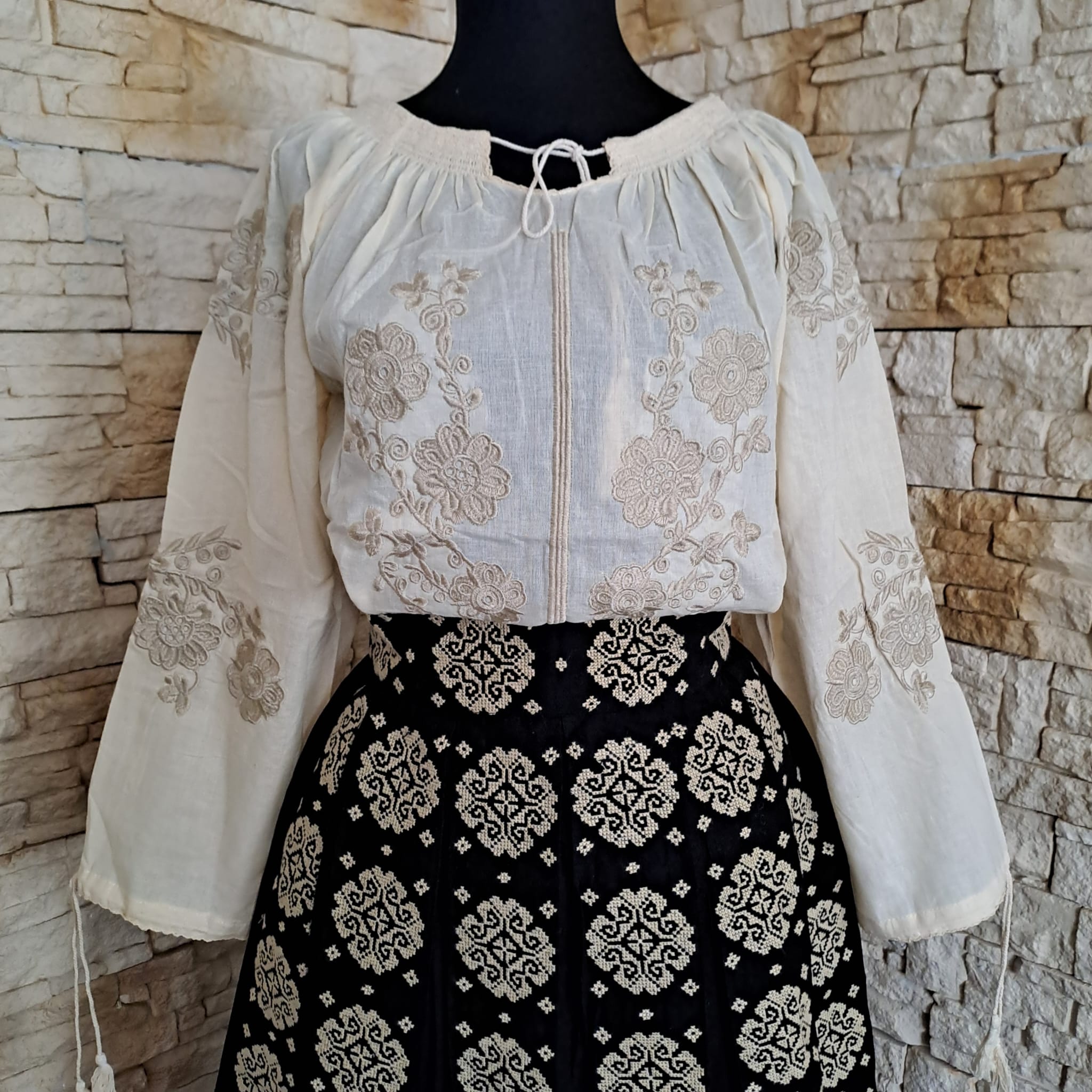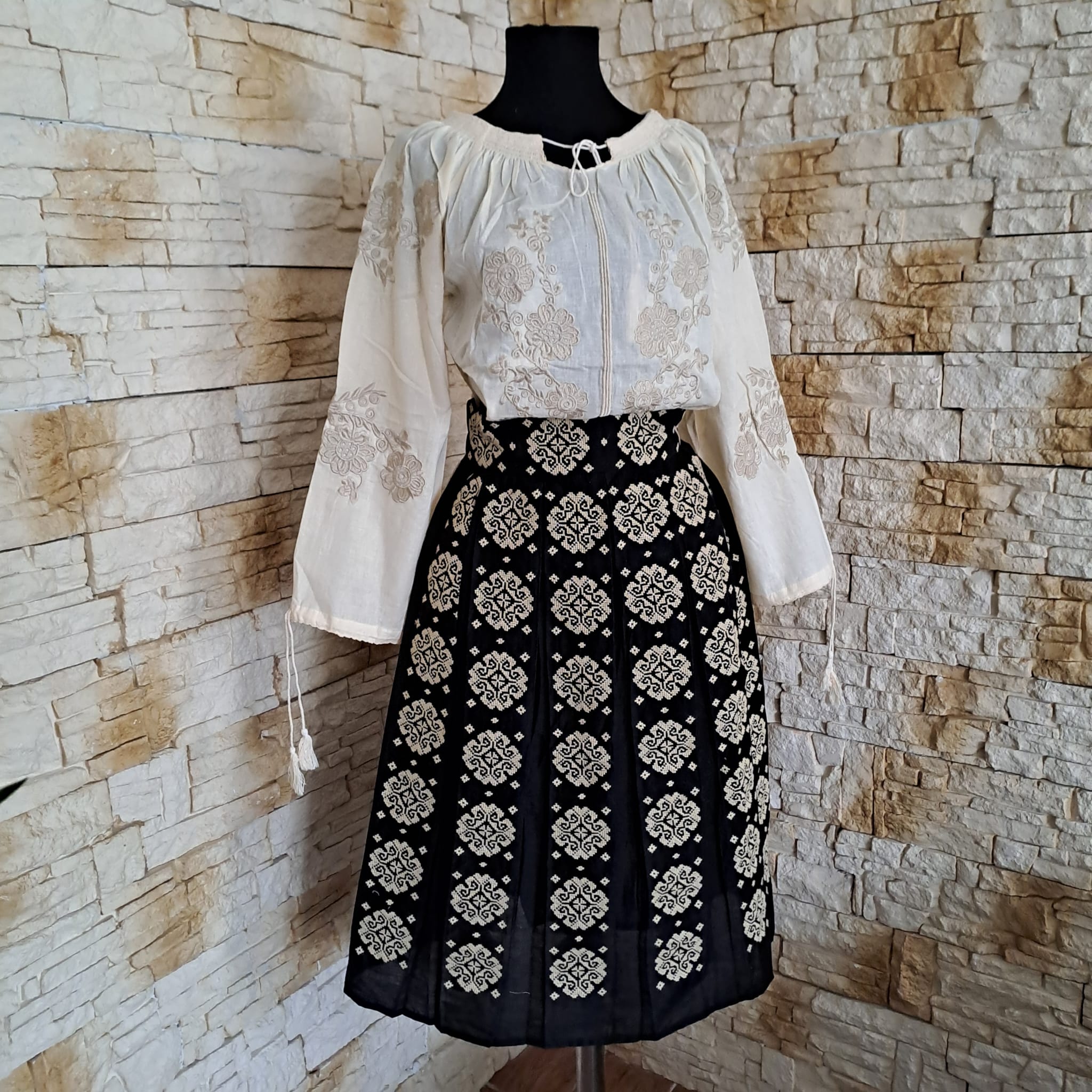 Set ie cu fusta dama, brodata cu motiv geometric. Materialul este in topit.  Fusta este fond negru, brodata peste tot fata/ spate cu ata bej.  La talie in partea din fata este brodata iar in partea din spate este cu elastic. Nu este transparenta, are jupa. Ia este fond bej brodata cu ata din matase bej.