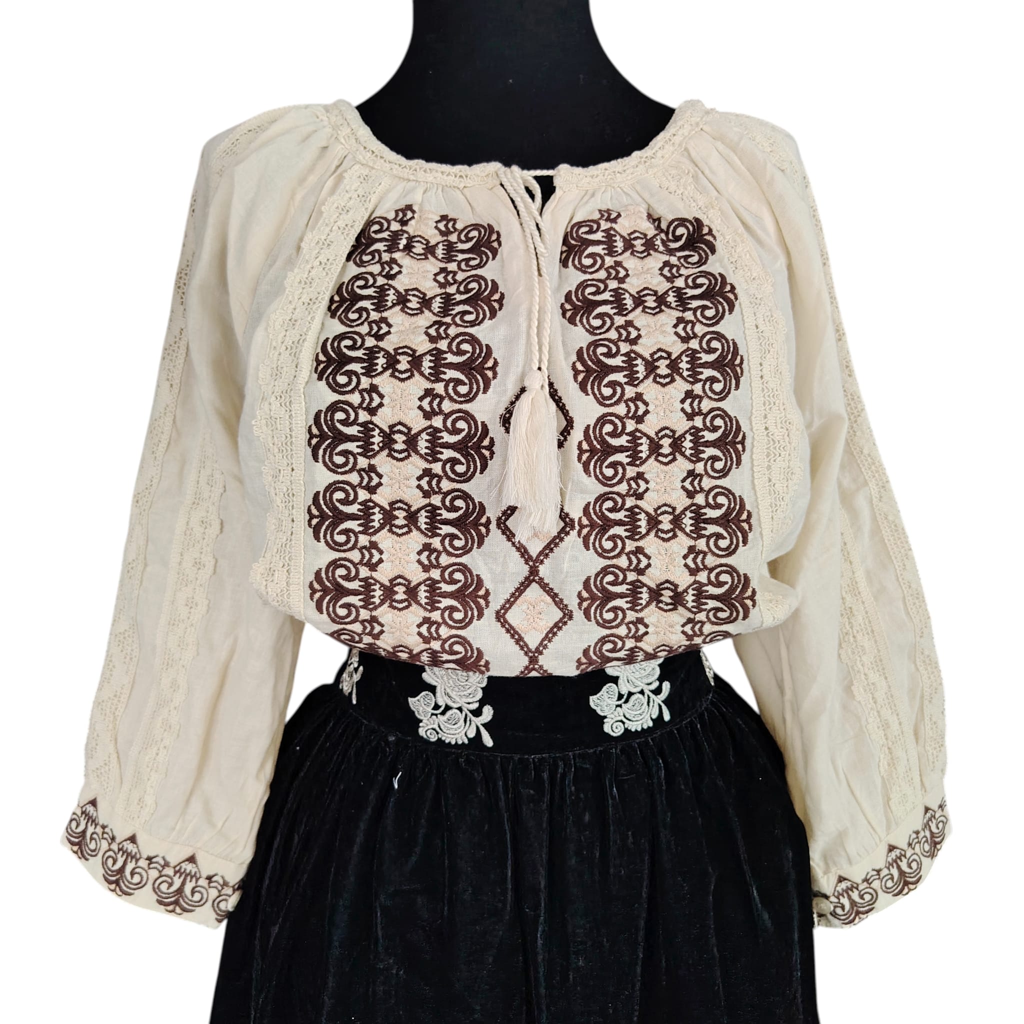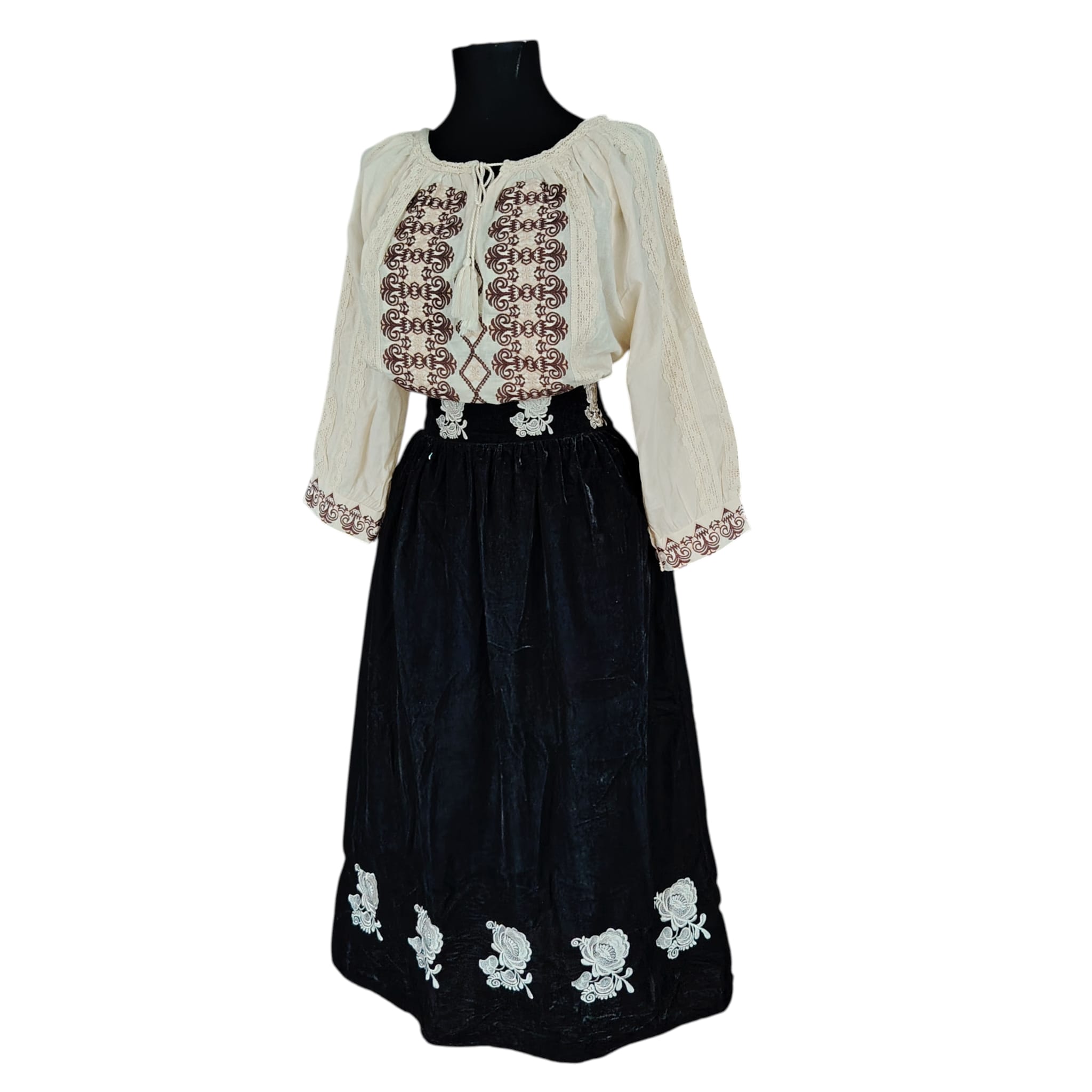 Set 2 piese , ie cu fusta. Ia este fond bej, brodata cu ata maro si alicatii din dantela iar fusta este din catifea brodata cu ata din matase bej , motiv floral. Acest set se poarta cu placere la evenimente culturale sau traditionale.