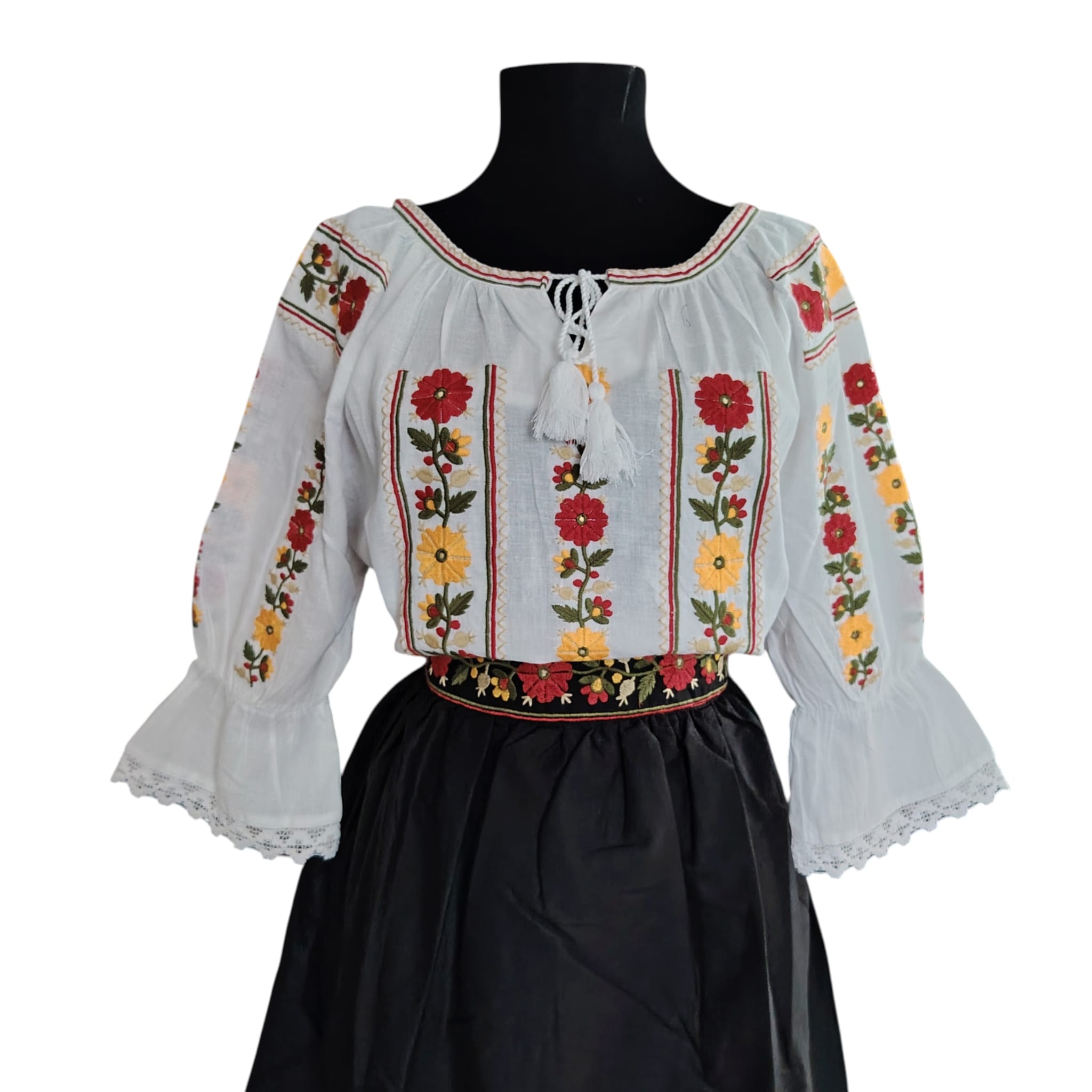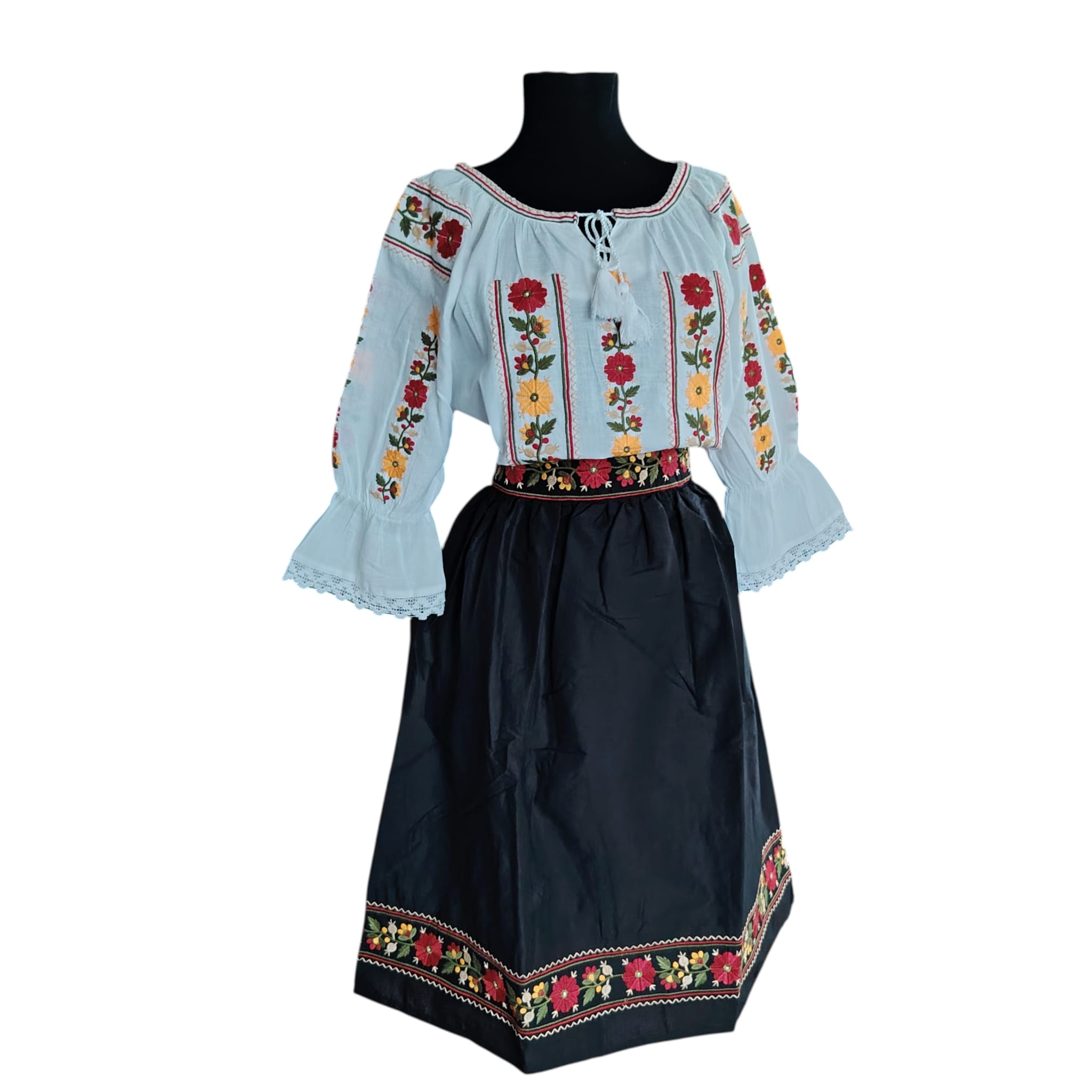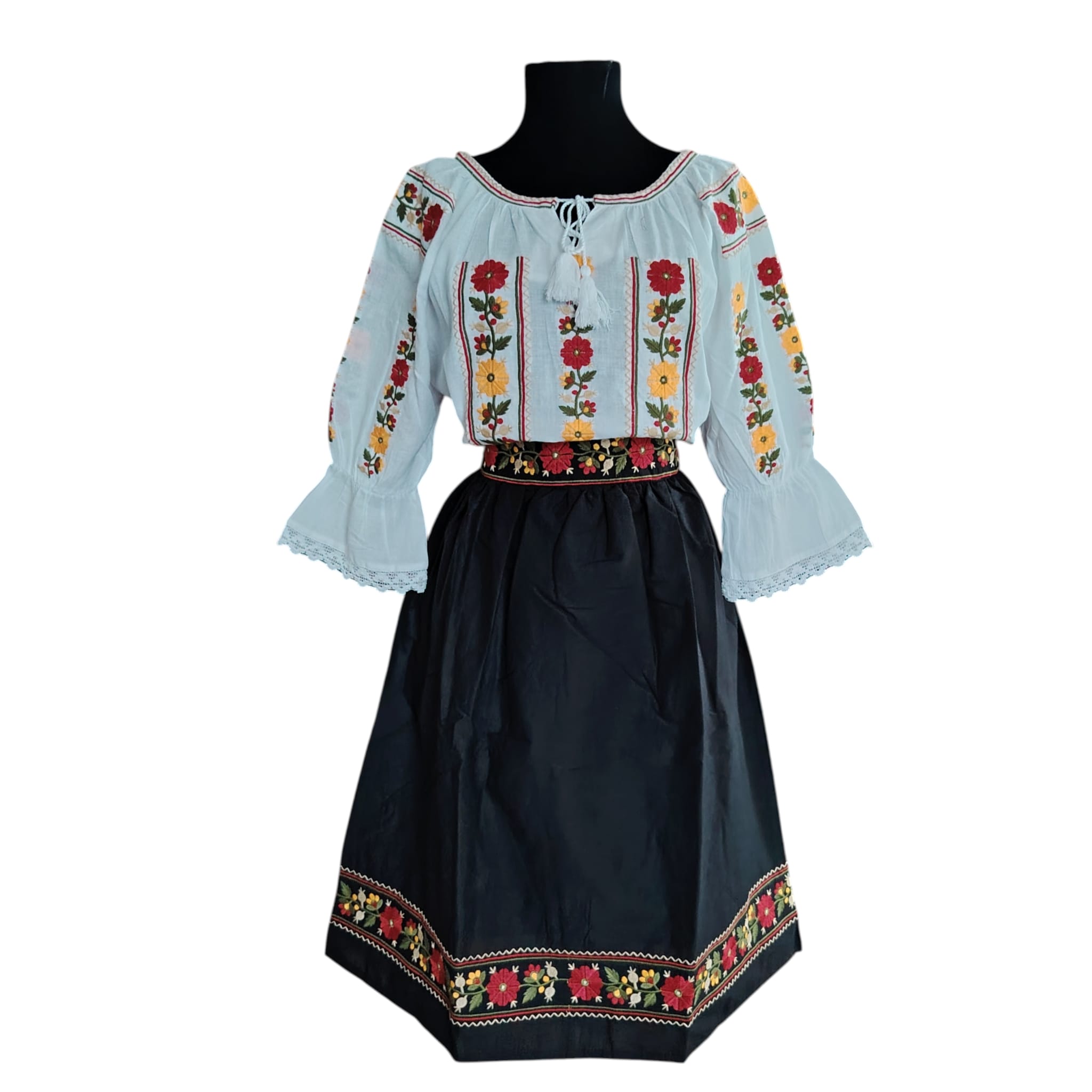 Set ie cu fusta dama, brodata cu motiv floral. Materialul este in topit . Fusta este fond negru, brodata la talie si jos, de jur imprejur cu ata colorata. In talie in partea din fata este brodata , iar in partea din spate este cu elastic. Nu este transparenta , are jupa. Ia este fond alb, brodata cu ata colorata.