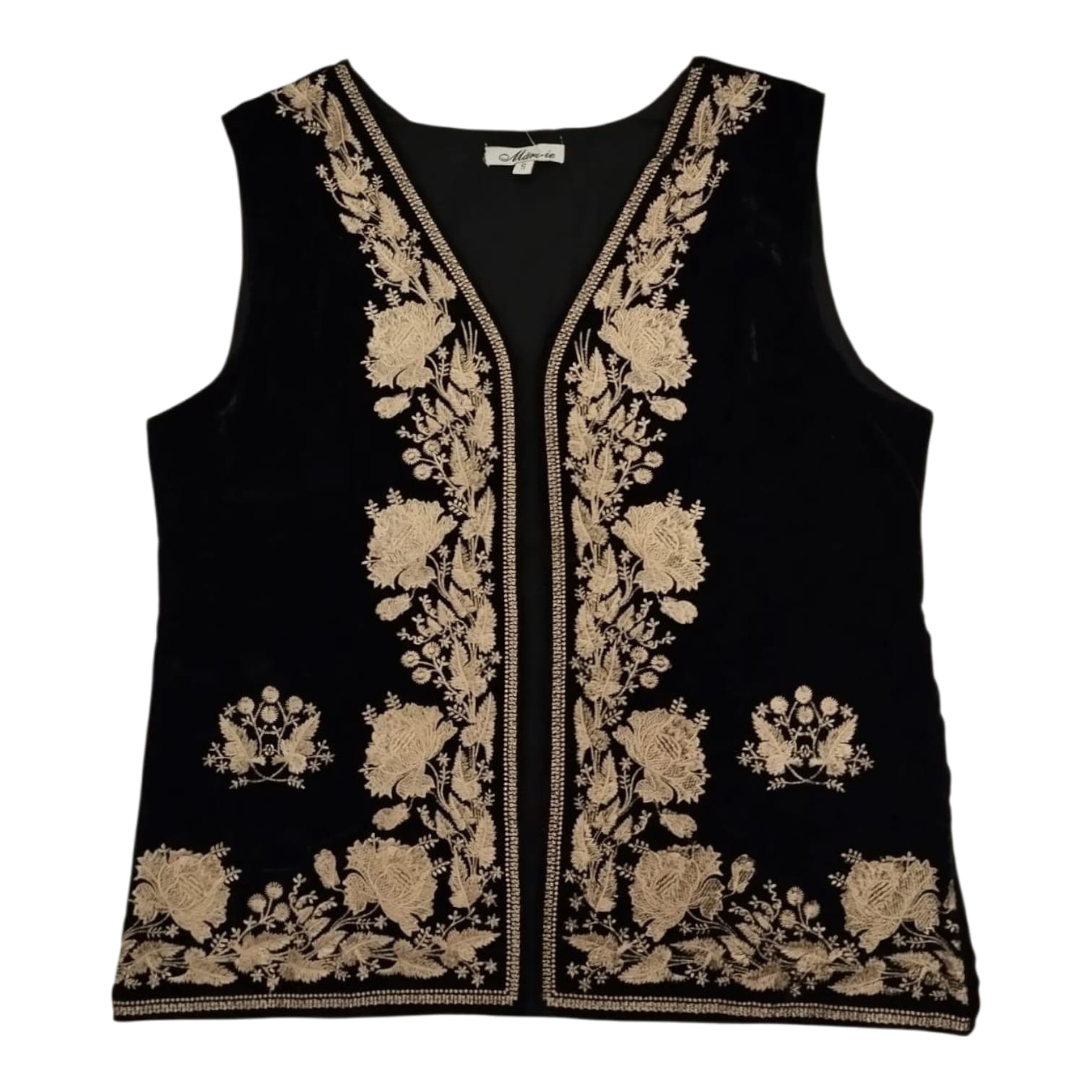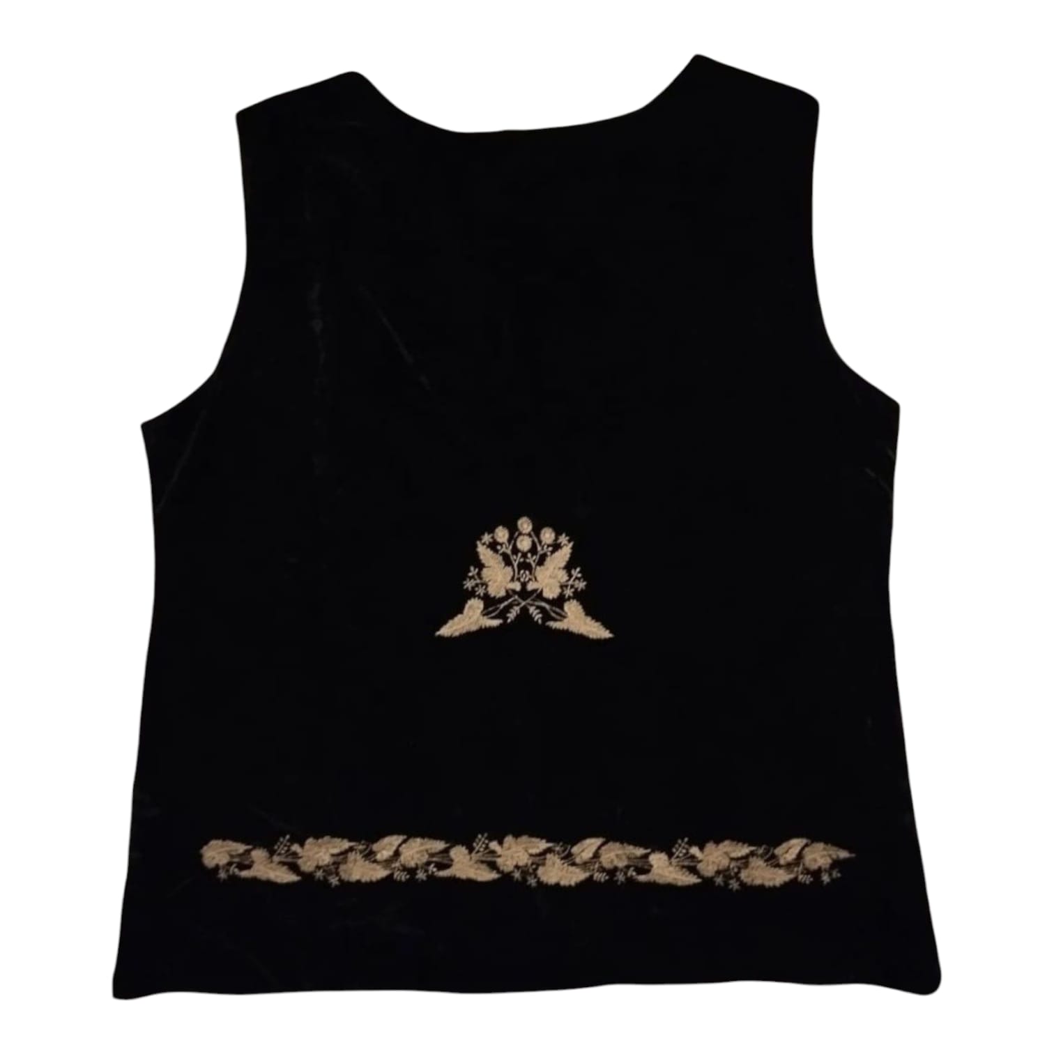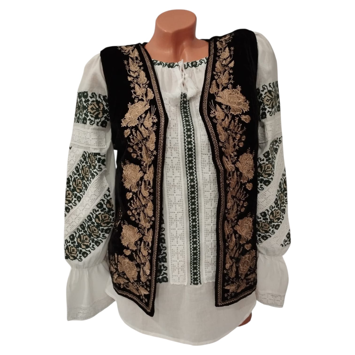 Vesta fond negru din catifea brodata cu ata din matase bej, motiv floral. Este brodata de jur imprejur in partea de jos. Este o vesta eleganta ce se poarta cu mandrie .