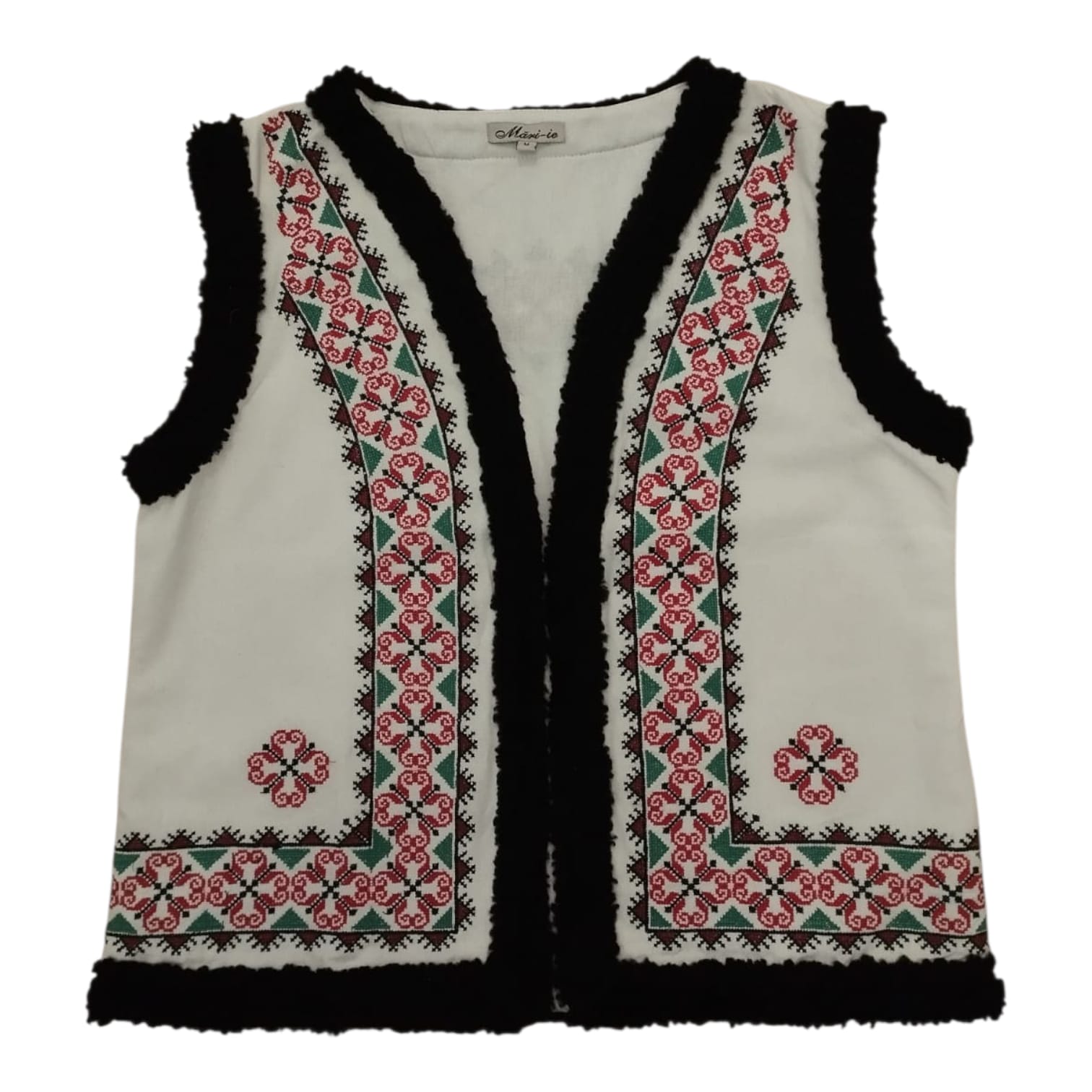 Vesta traditionala brodata cu ata colorata, motiv geometric. Pentru ca are materialul foarte bun [ in ] , da o nota de eleganta . Poate fi purtata cu ie traditionala , dar si accesorizata cu alte articole de imbracaminte. Vesta are captuseala iar pe margine are terminatie cu blanita.