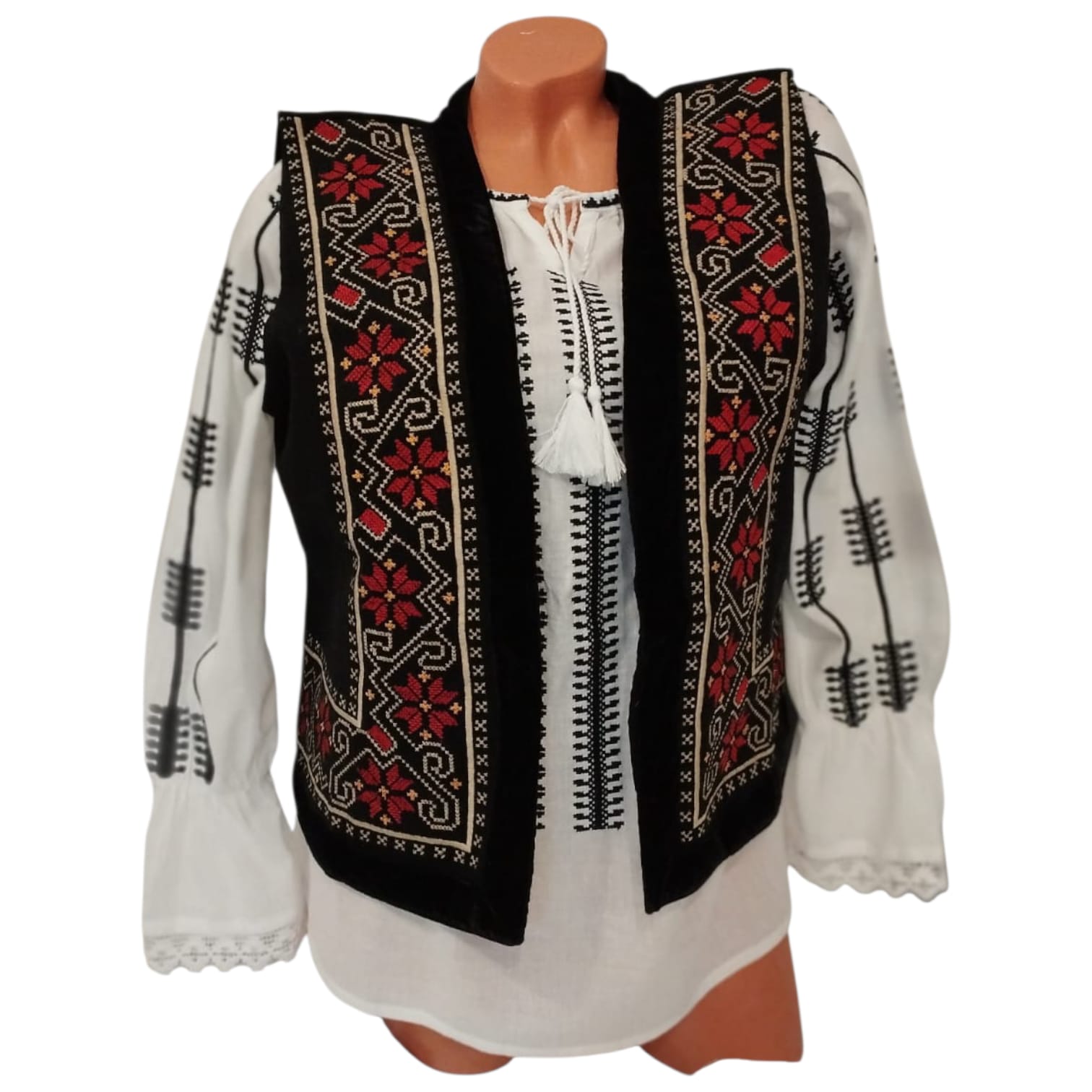 Vesta traditionala brodata cu ata rosie si bej, motiv geometric si floral. Pentru ca are materialul foarte bun [ stofa din lana] , da o nota de eleganta . Vesta are marginile cu terminatii din catifea. Poate fi purtata cu ie traditionala , dar si accesorizata cu alte articole de imbracaminte. Vesta are captuseala .