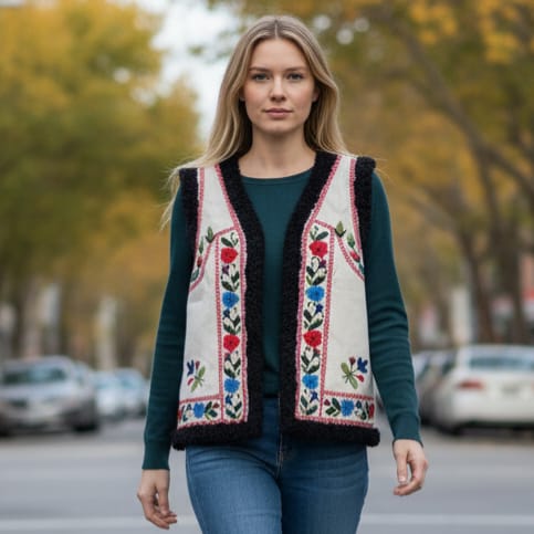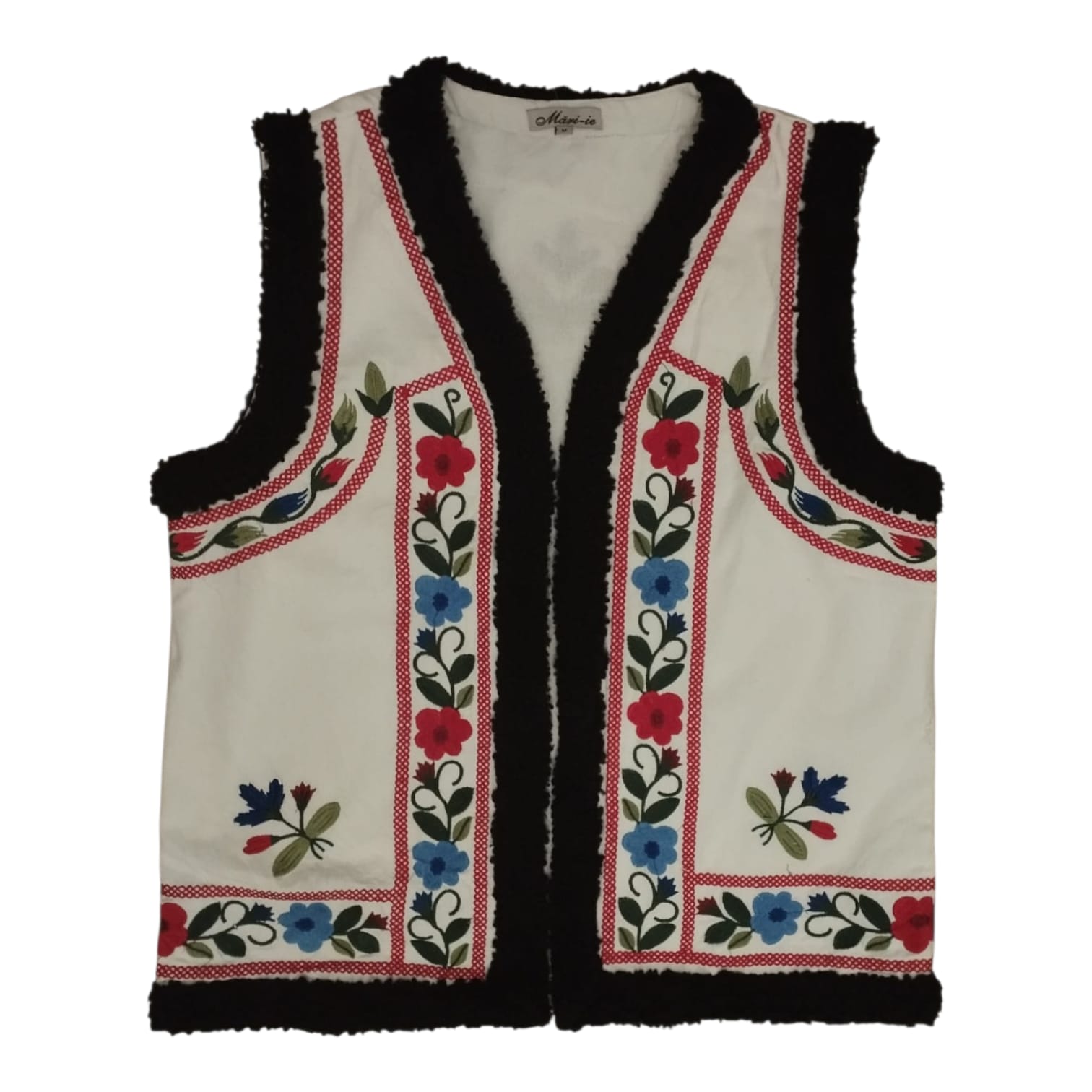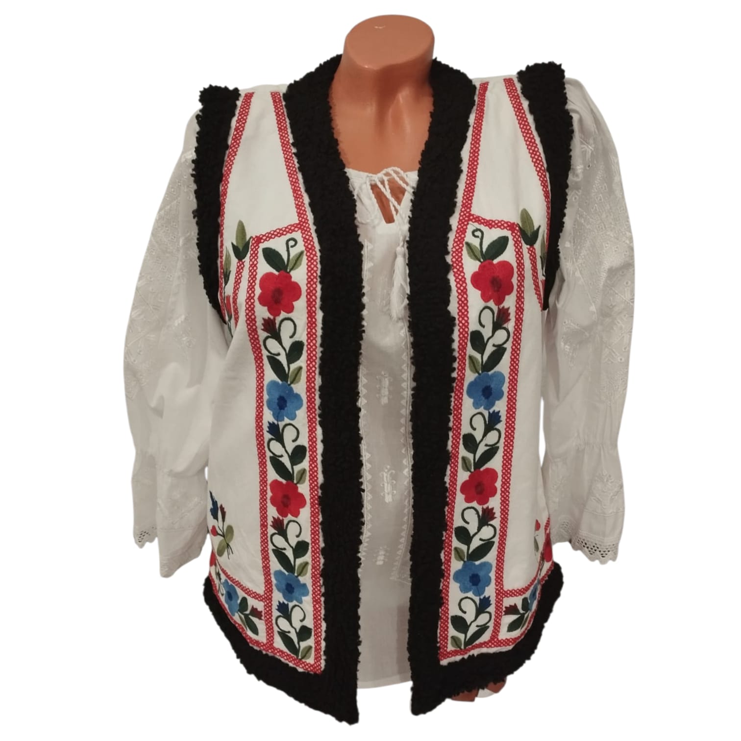 Vesta traditionala brodata cu ata colorata, motiv floral. Pentru ca are materialul foarte bun [ in ] , da o nota de eleganta . Poate fi purtata cu ie traditionala , dar si accesorizata cu alte articole de imbracaminte. Vesta are captuseala iar pe margine are terminatie cu blanita.
