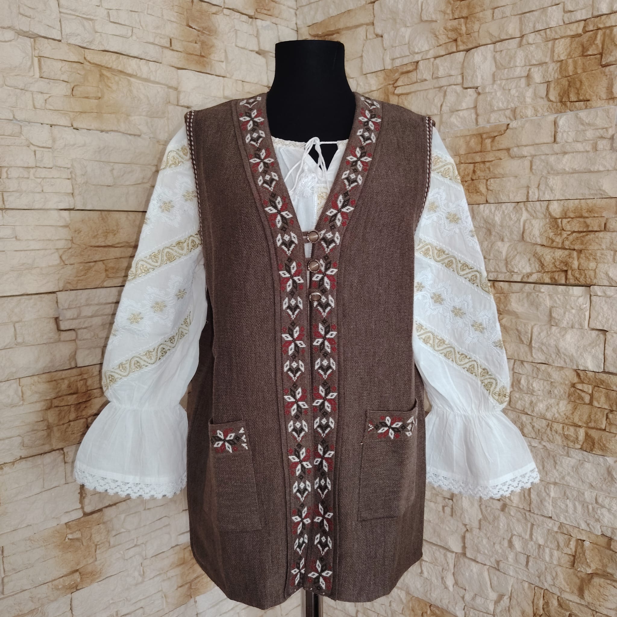 Vesta tricotata fond maro cu model floral. Are buzunare si inchidere cu 2 nasturi.
